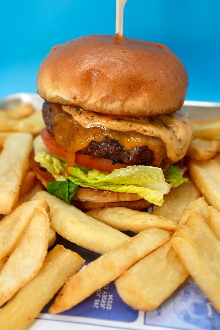 8 oz thick patty, lettuce, tomato, onion, American cheese, chipotle mayo on a brioche bun.